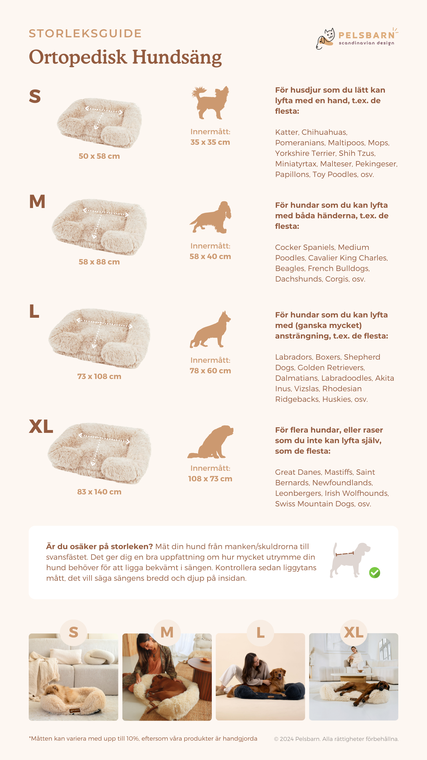 Vår Pelsbarn Ortopediska Lugnande Hundsäng finns i fyra olika storlekar. Vi ber dig vänligen att läsa storleksguiden i produktbeskrivningen ovan innan du väljer storlek.