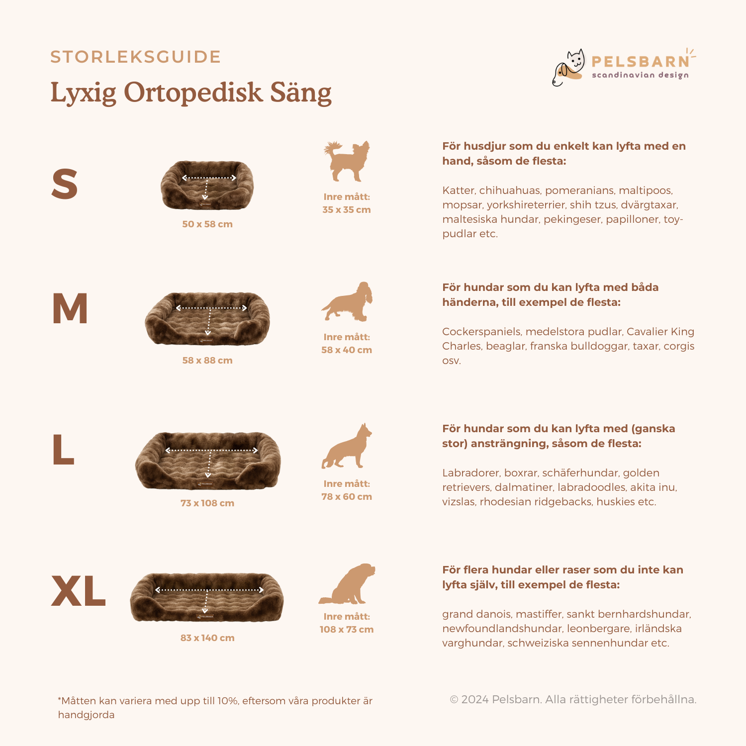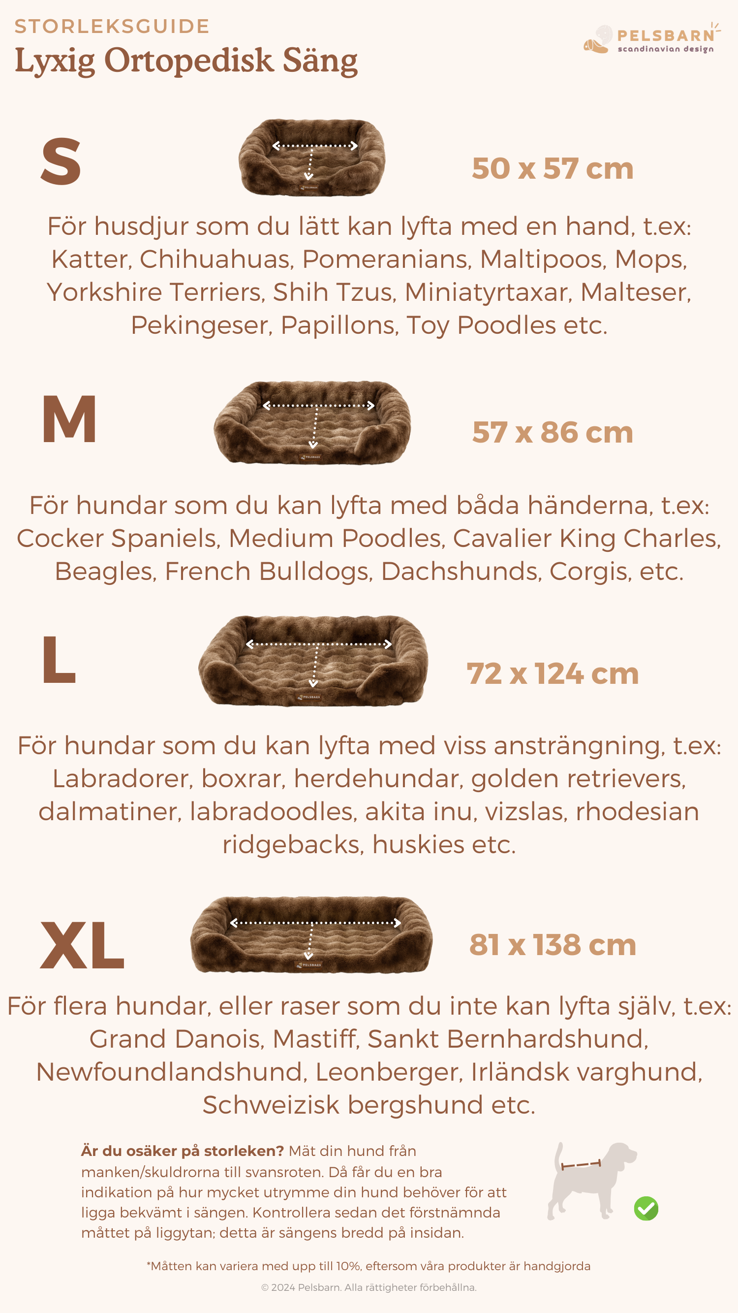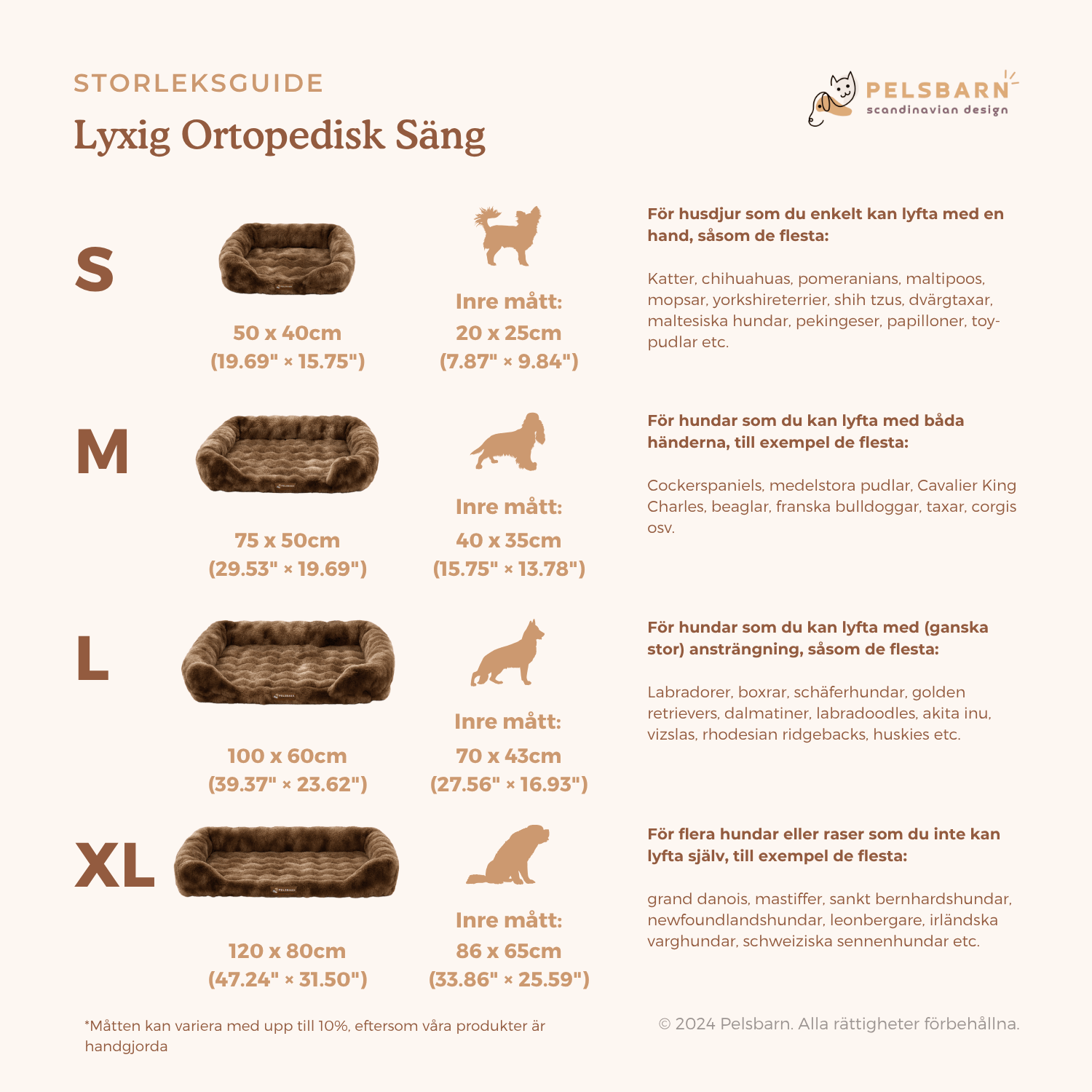 Vår Pelsbarn Lyxiga Ortopedisk Säng finns i fyra olika storlekar: S, M, L och XL